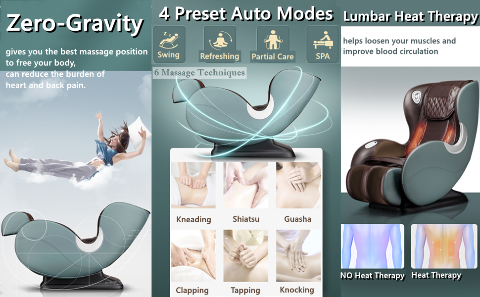 • Zero-Gravity Massage: The Zero-Gravity Massage gives you the best massage position to free your body, can reduce the burden of heart and back pain.