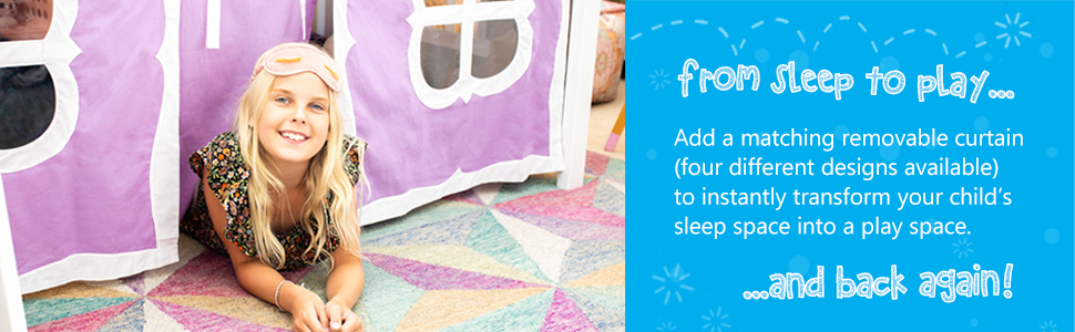 Fun: removable curtains turn under bed area into a play-space. Curtain includes one front panel and one side panel. Easily attaches with hook and loop fastener strip. Hand-sewn, 100% cotton