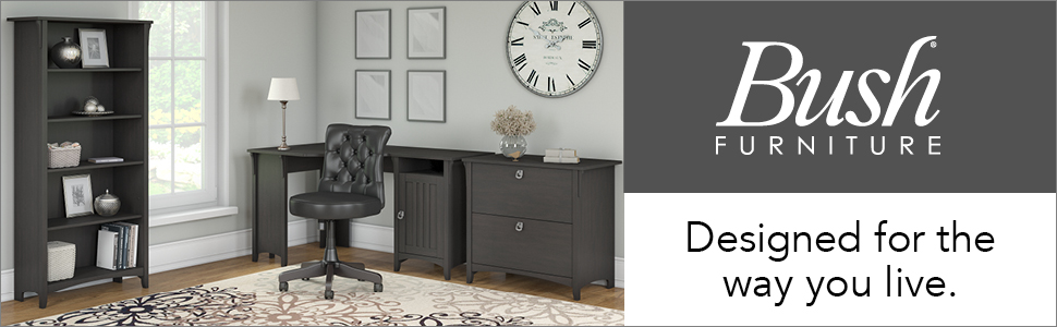 Feel comfortable in your home office with the casual styling of the Bush Furniture salinas collection. The versatile features of the Mission desk with hutch, lateral file cabinet and 5 shelf bookcase help you feel organized and keep your home looking great. Spread out on the desk surface while organizing cords in the cable management system. Store a keyboard or laptop on the pull-out shelf, and stash supplies in a box drawer and cabinet. Display photos, books and more in the open spaces of the hutch and in the 5 shelf bookcase, while you file your worries away in the 2 drawer cabinet. Attractive wood details, vertical accents, curved base rails and tapered legs create a casual look fit for a cottage, family home or apartment. Metal drop pull hardware complements the vintage black finish, which features a distressed touch to add a country feel to your space. Backed by a 1 year warranty.