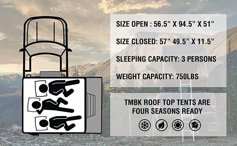 If you want a burly, strong, durable and Light Weight Roof Top Tent, you've come to the right place. Our TMBK 3 Person Tent features double-grid Rip-Stop nylon which is built for the long-haul and is 50% stronger than other material. Our base features an insulated reinforced welded one-piece frame with stainless-steel heavy-duty hinges that will last a lifetime. This tent has a skylight so you can enjoy the cool evenings or the morning sunrise. Our TMBK 3 Person Tent is big enough for a small family and only weighs about 100 lbs. If you have a SUV, Cross Over, Jeep or Truck with a rack this will install with no modifications and comes with all the tools necessary to install.