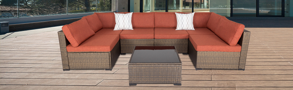 【Premium Material】This sectional sofa set is constructed from a rust-resistant steel frame and PE Rattan Wicker. Rattan is more durable and long lasting than traditional wicker, making this piece more heat and weather resistant than similar wicker furniture.