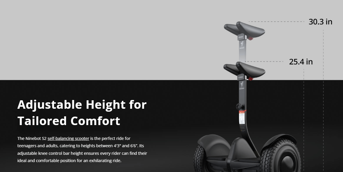 The Ninebot S2 offers the perfect self-balancing scooter experience for riders seeking both style and comfort. Whether teen or adult, users can easily adjust the knee control bar height to achieve a personalized fit. The RGB wheel lights and taillights can also be personalized to reflect individual mood and personality. With a built-in Bluetooth speaker, riders can sync their devices to pair the perfect playlist with a smooth ride.